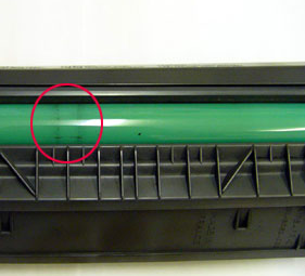 לעיל גליל טעינה ראשוני חדש ומשומש,פגמים בגליל טעינה ראשונית יובילו לחזרה מרובה של מעל לחמש פעמים על גבי המדיה המודפסת.